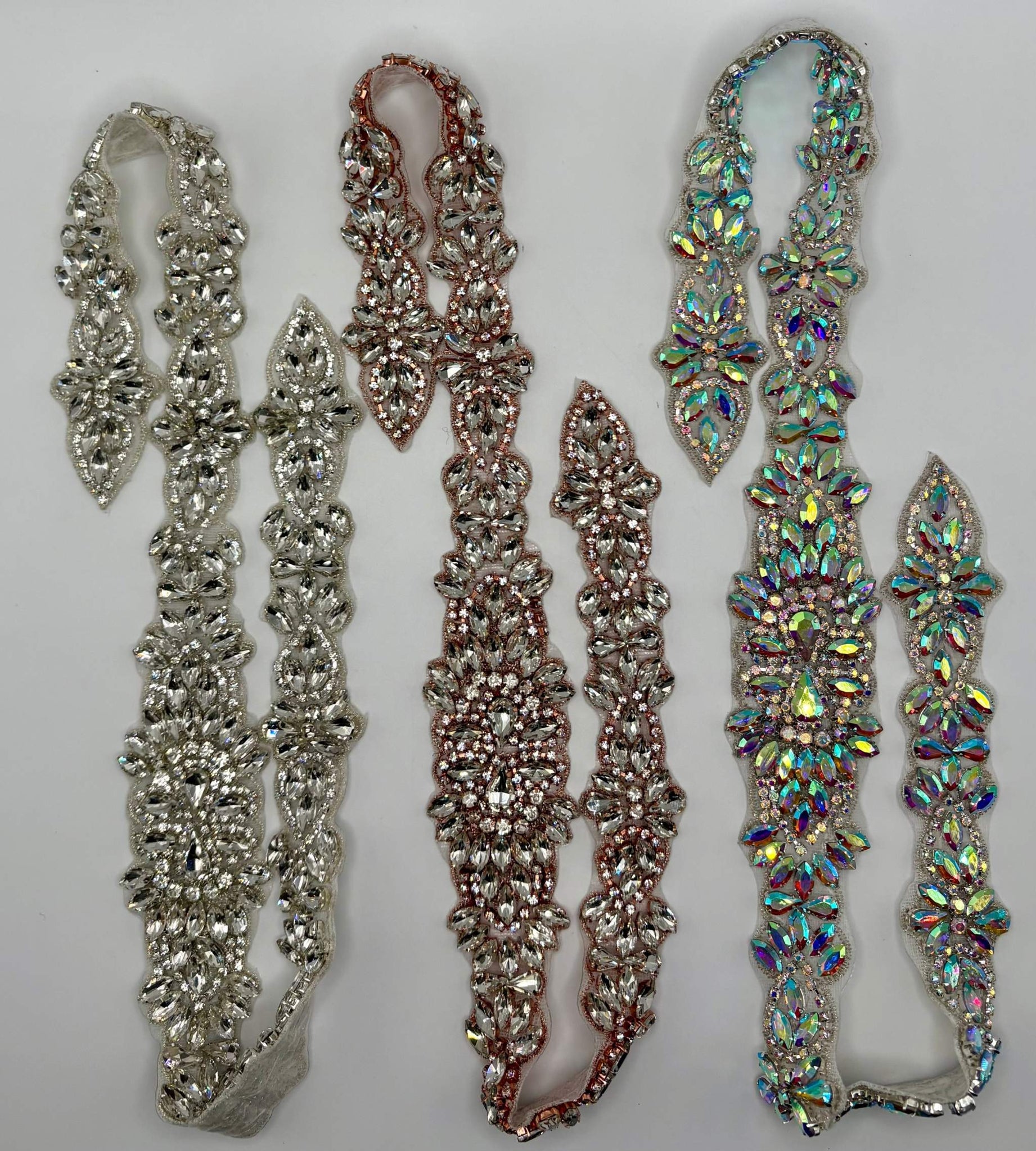 Handmade rhinestone bridal belts with pearls and glass beads in gold.