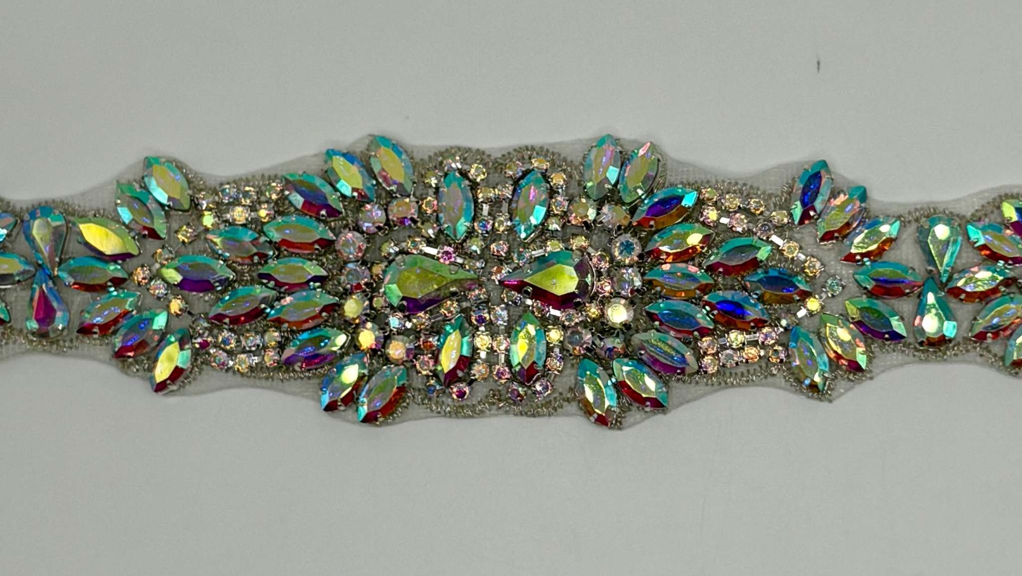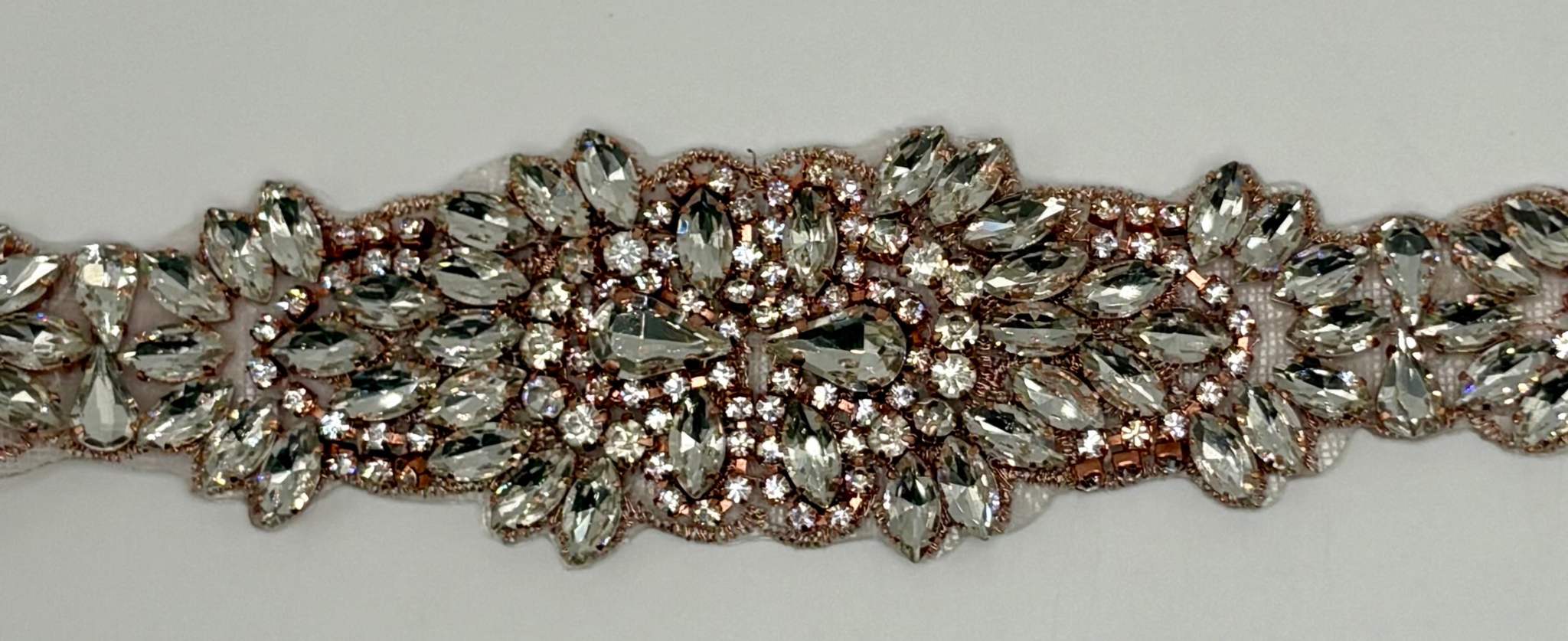 Handmade Belt Appliqué with Clear Rhinestones, Pearls, and Glass Beads in Gold