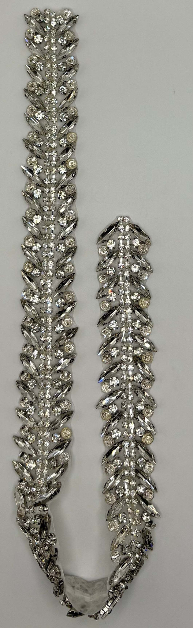 Handmade clear rhinestone bridal belt on silver, approximately 17.5 inches long.